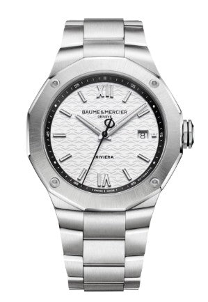 THE RIVIERA 10829 IS DISTINGUISHED BY A BLACK AND WHITE CONTRAST THAT IS BOTH BOLD AND HARMONIOUS. ITS WHITE DIAL WITH A WAVE DECOR IS HIGHLIGHTED BY A BLACK BEVEL. THE RIVETED ROMAN NUMERLAS, INDEXES, AND FACETED RHODIUM-PLATED HANDS ARE COATED WITH WHITE SUPERLUMINOVA. THE BLACK SECONDS HAND WITH PHI LOGO ON THE COUNTERWEIGHT ACCENTUATE THIS TWO-TONE DESIGN. IT IS EQUIPPED WITH AN AUTOMATIC SW200 MOVEMENT WITH A 38-HOUR POWER RESERVE AND WATER RESISTANCE TO 10 ATM. THE INTERCHANGEABLE STAINLESS-STEEL BRACELET FEATURES A RELIABLE SYSTEM FOR TOOL-FREE CHANGES.