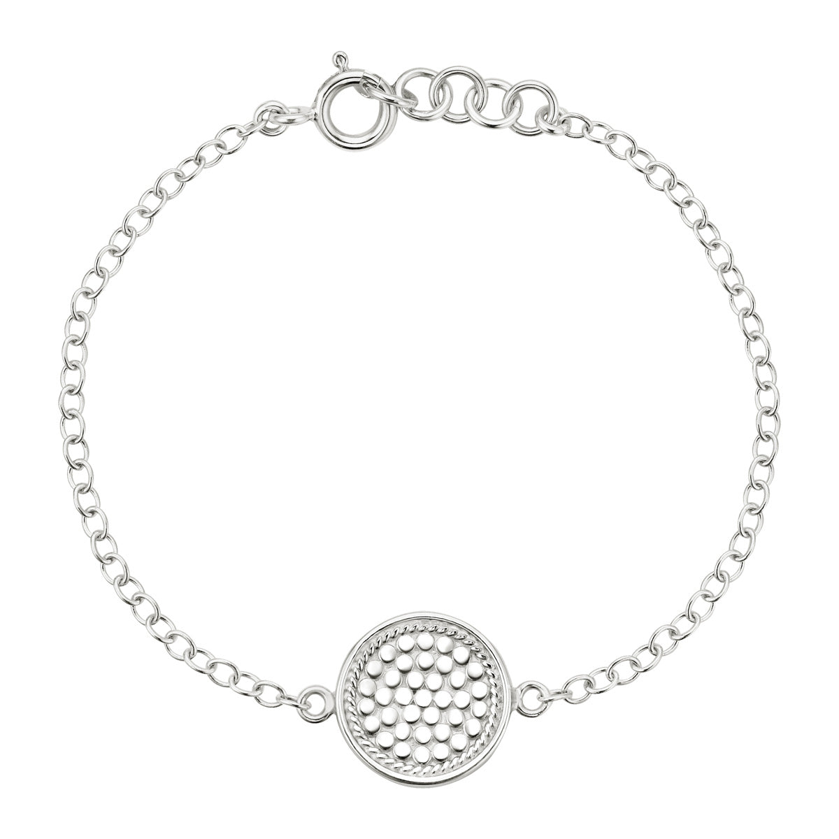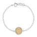 Smooth silver-rimmed gold-plated and sterling silver reversible disk bracelet on a 7" silver chain.
