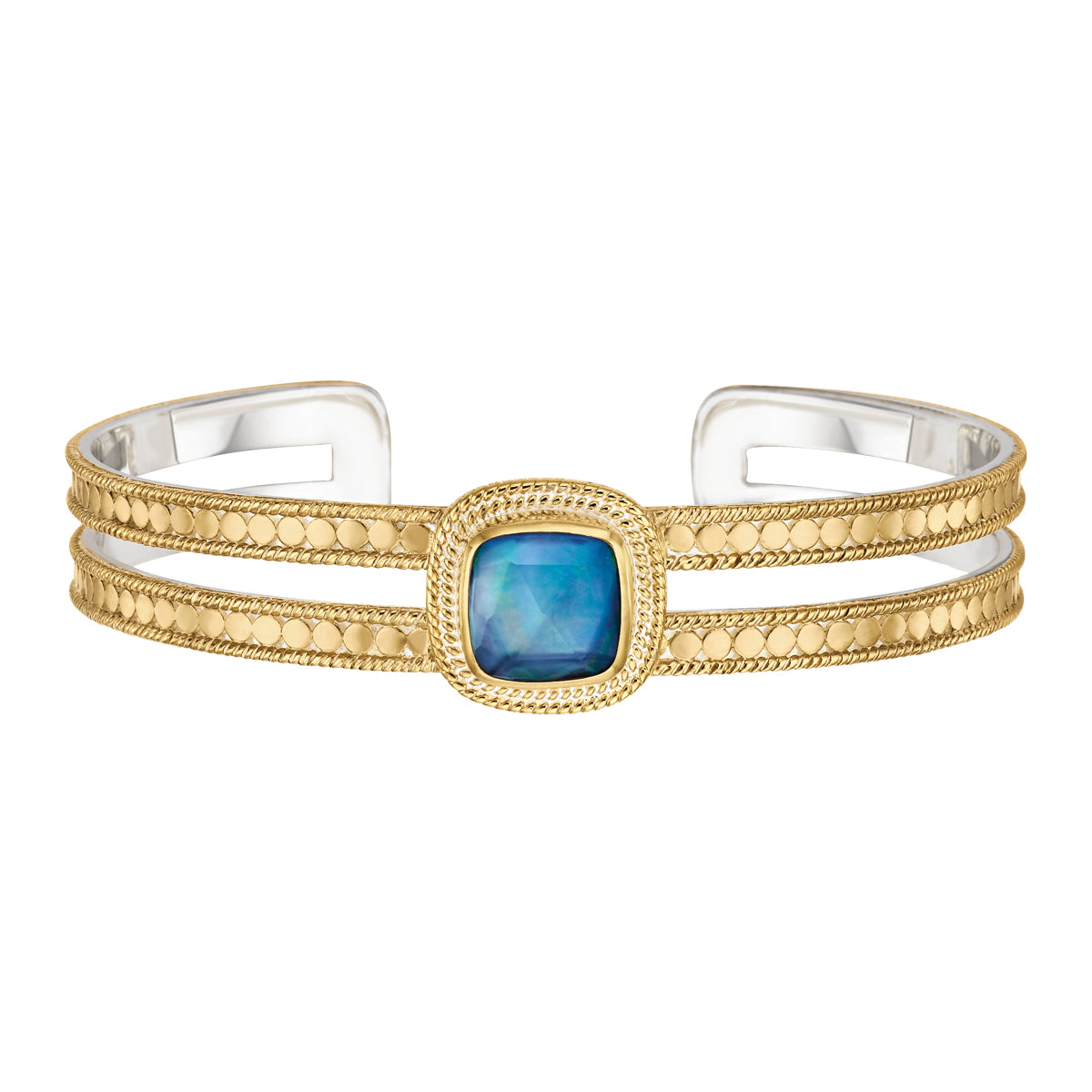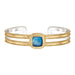 Wire-rimmed gold-plated double bar cuff with square shaped lapis layered under white quartz and mother of pearl.