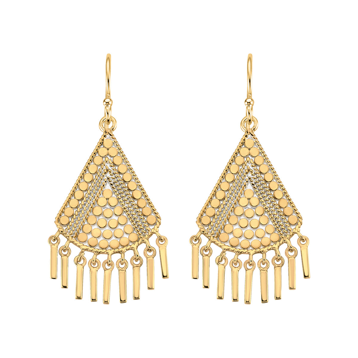 Wire-rimmed gold-plated fringe drop earrings with gold-plated French wire.
