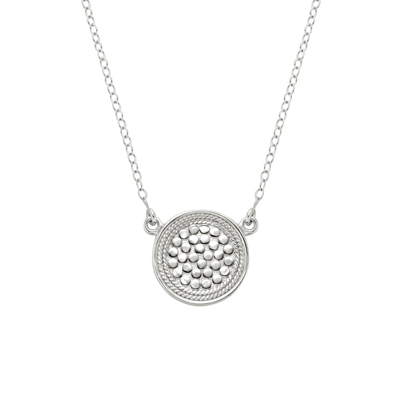 Reversible disk necklace with smooth silver rim on 16" to 18" adjustable silver chain.