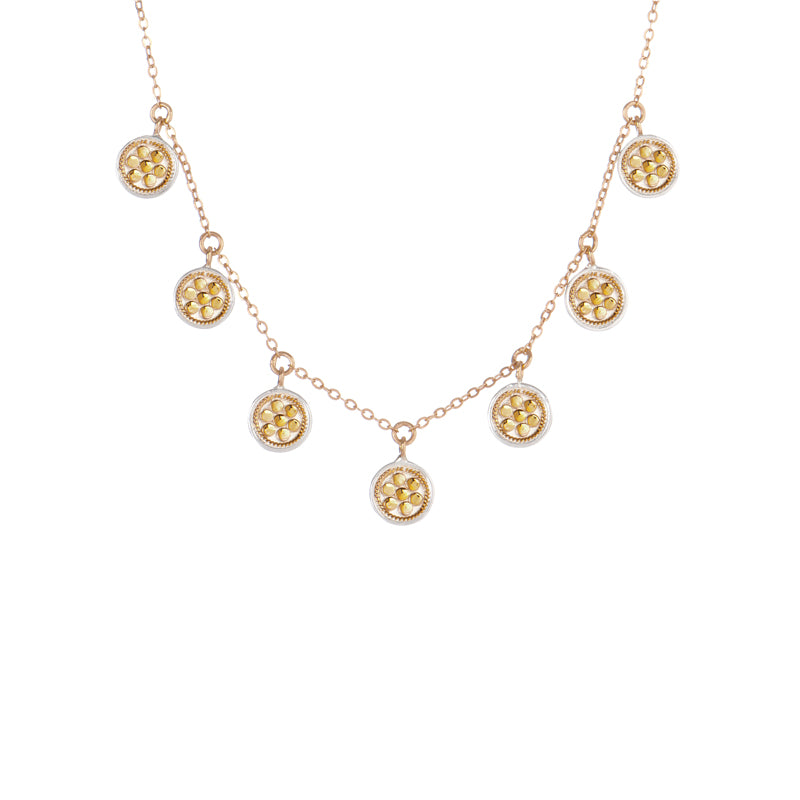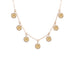 Gold-plated mini disk charm necklace on 16" to 18" adjustable gold chain. Each mini disk has a smooth silver rim.