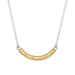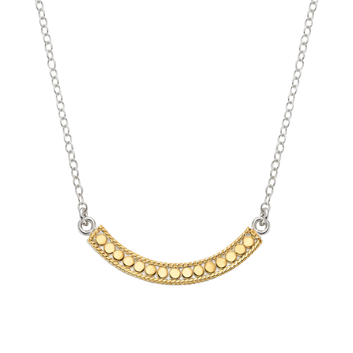 Wire-rimmed gold-plated and sterling silver reversible curved bar nacklace on 16" to 18" adjustable silver chain.