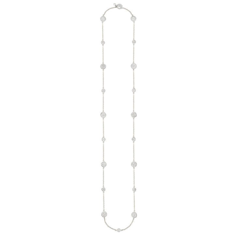 Silver multi-disk necklace on 40" silver chain with toggle closure. Each disk has a smooth silver rim.