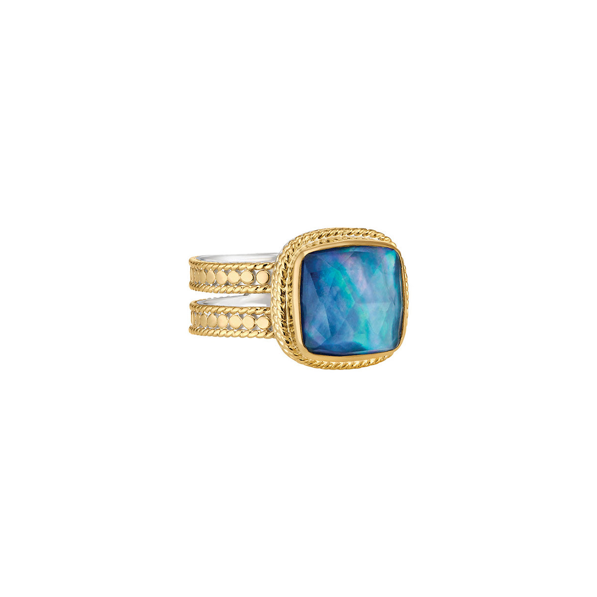 Wire-rimmed gold-plated square ring with lapis layered under white quartz and mother of pearl.