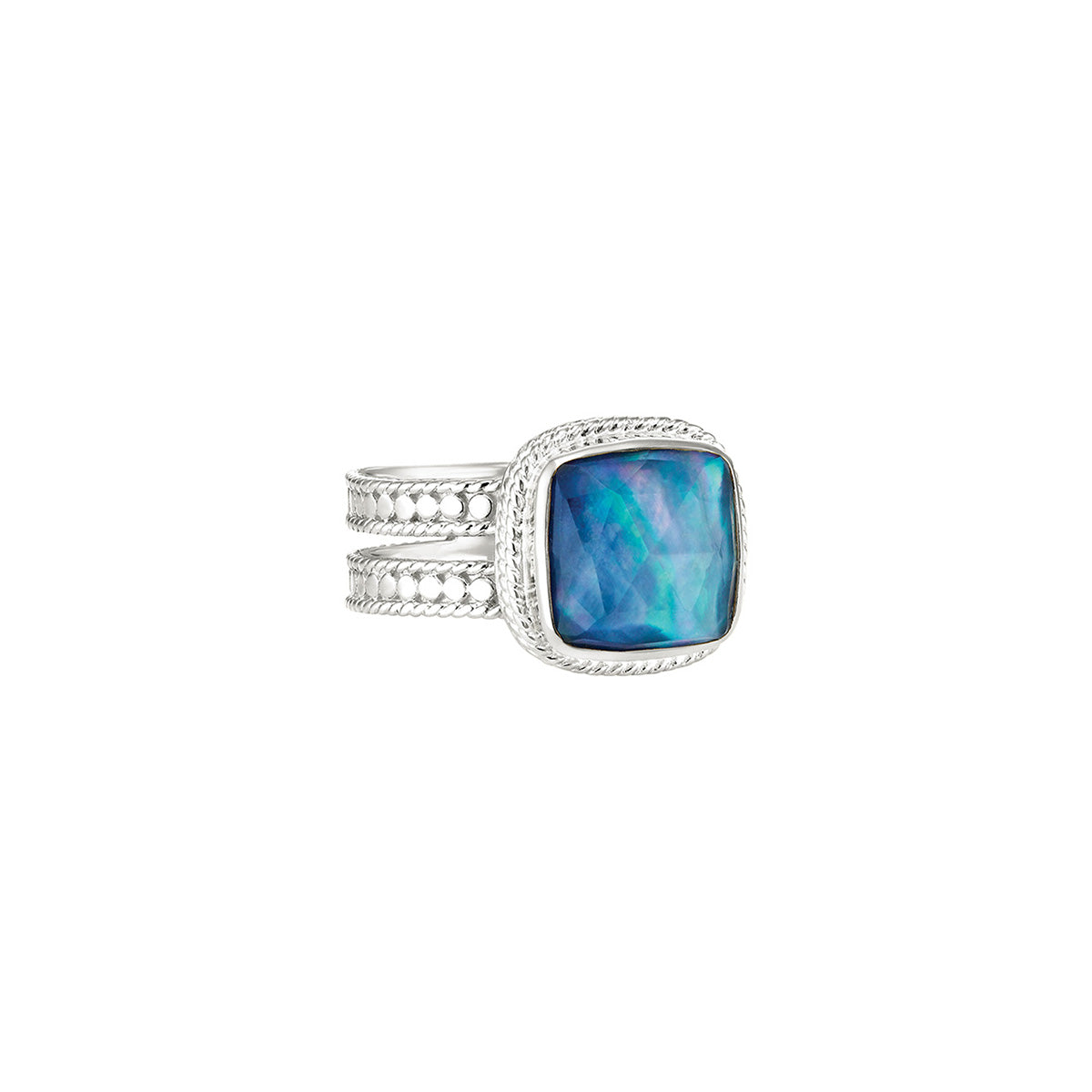 Wire-rimmed sterling silver square ring with lapis layered under white quartz and mother of pearl.