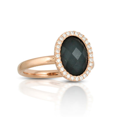 Layers of charcoal grey hematite and pure white topaz result in iridescent grey hues.