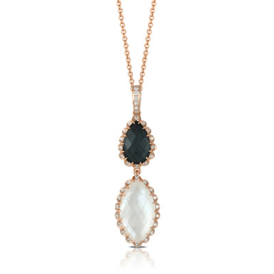 Clear white topaz layered with hematite and white mother of pearl; timeless beauty with an edge.