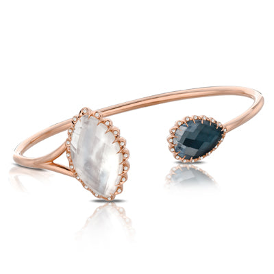 Clear white topaz layered with hematite and white mother of pearl; timeless beauty with an edge.