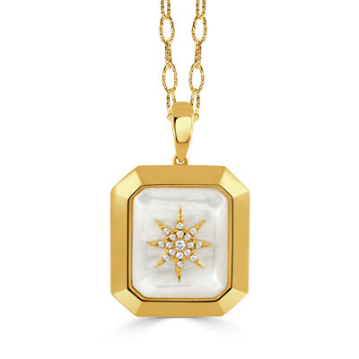 18K YELLOW GOLD DIAMOND PENDANT WITH CLEAR QUARTZ OVER WHITE MOTHER-OF-PEARL (CHAIN SOLD SEPERATE)