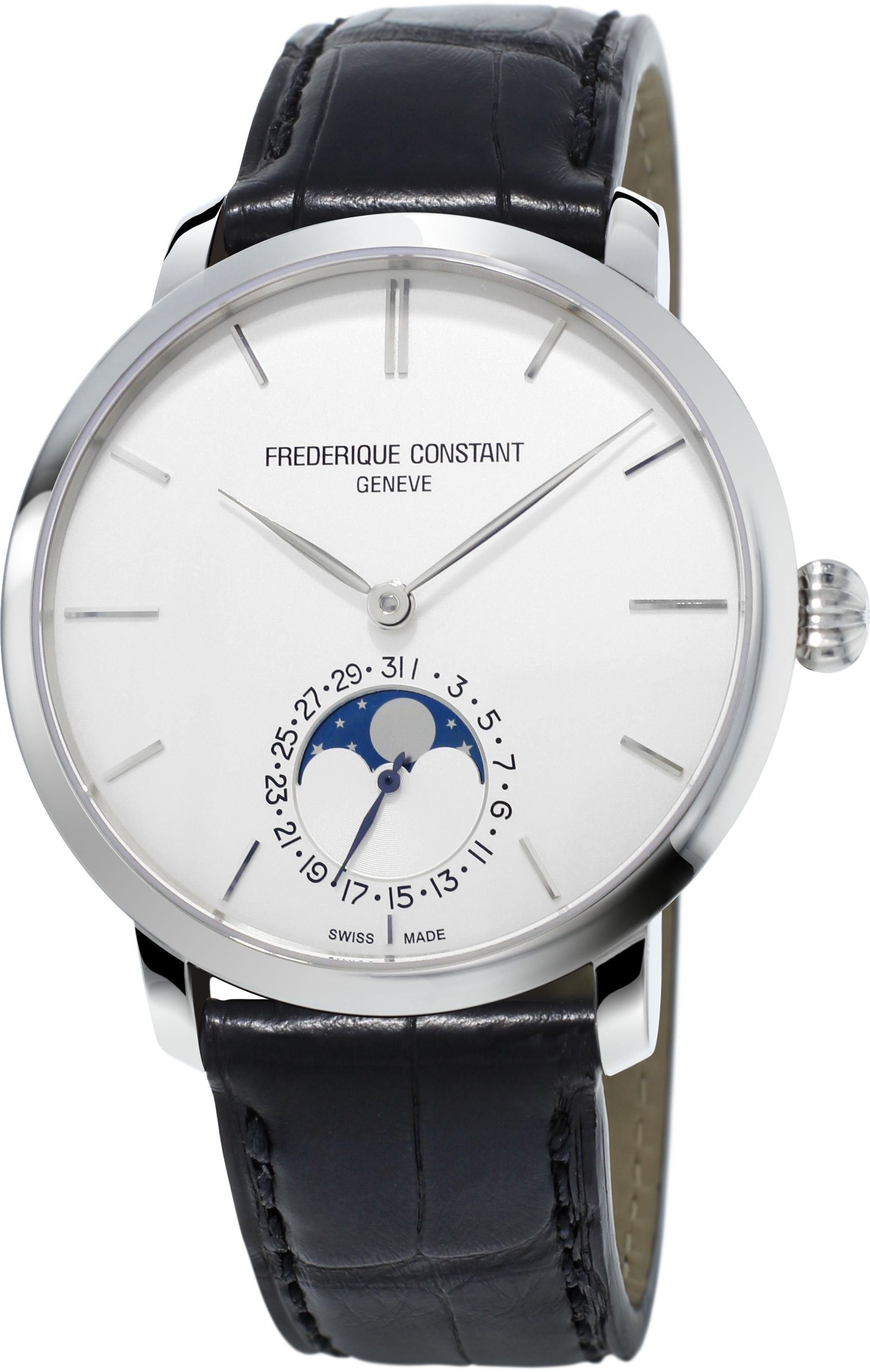 The elegant Slimline Manufacture Moonphase, fully conceived, developed, produced, assembled, adjusted and encased in-house. With its sleek case, silver dial with applied silvered indexes, black leath