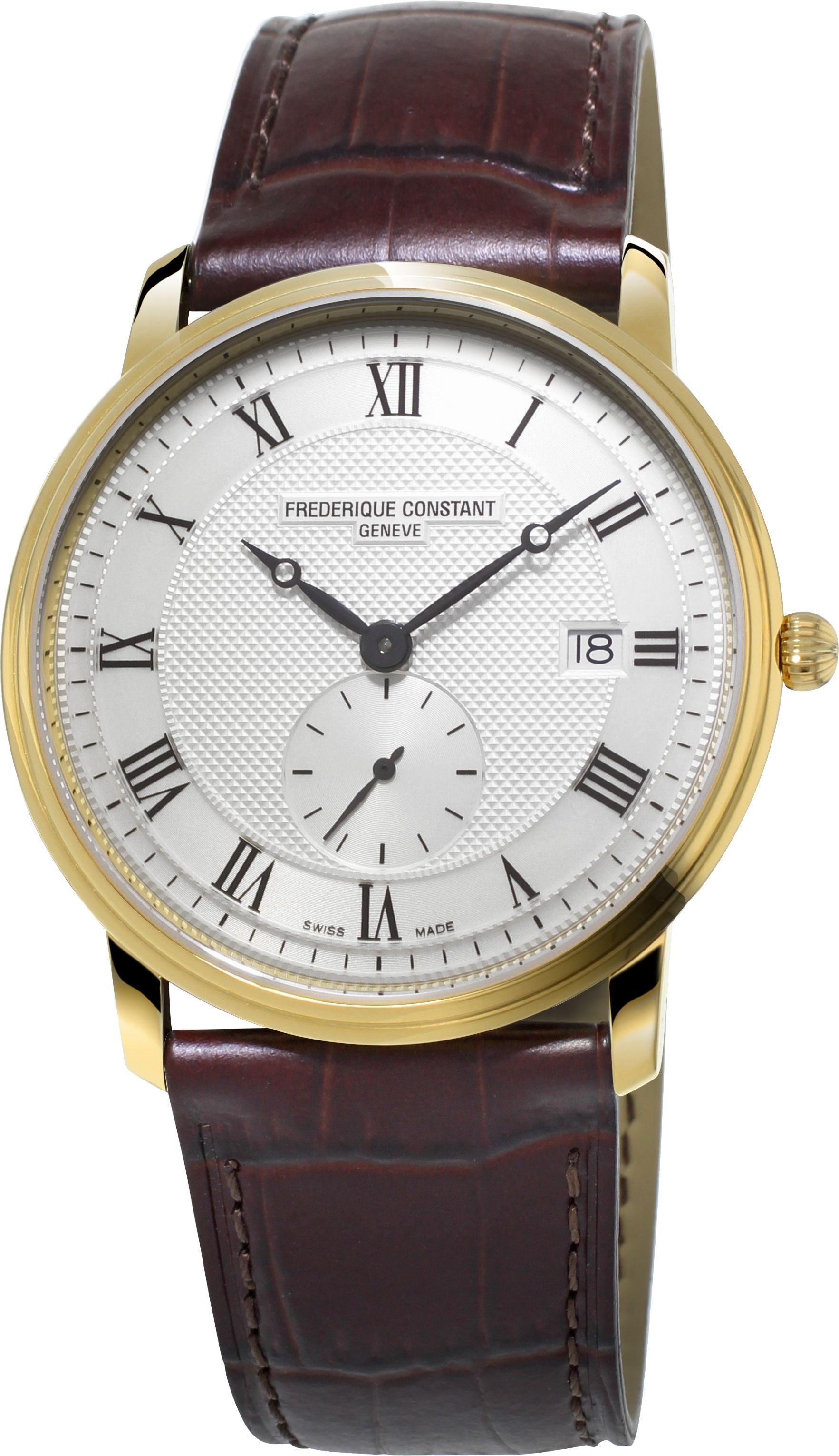 A perfect, classic timepiece. This Slimline Classics Men's Quartz has a small second hand with a white dial, guilloché decoration, printed roman numerals with a brown leather strap.