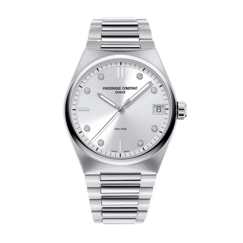 This 31mm Highlife Ladies Quartz showcases luxury on the wrist. The silver sunray dial features shimmering round diamond indexes and a date window at 3 o'clock. The stainless steel bracelet secures in place with a push-button-fold over clasp and the watch is water resistant to 50 meters.
