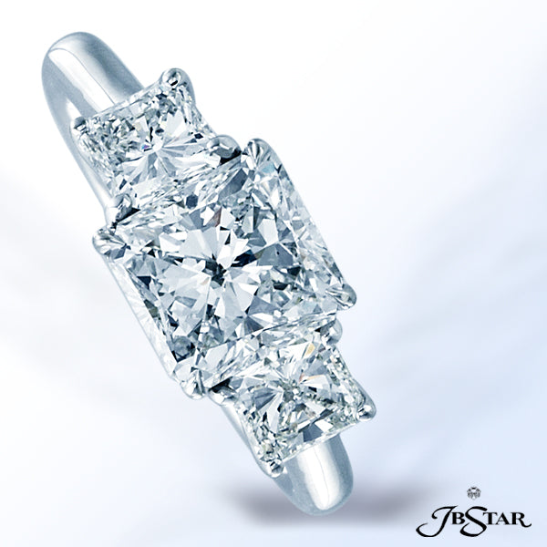 JB STAR DIAMOND RING FEATURING A STUNNING RADIANT-CUT 2.01 CT DIAMOND EMBRACED BY PRINCESS-CUT DIAMONDS; HANDCRAFTED IN PLATINUM.