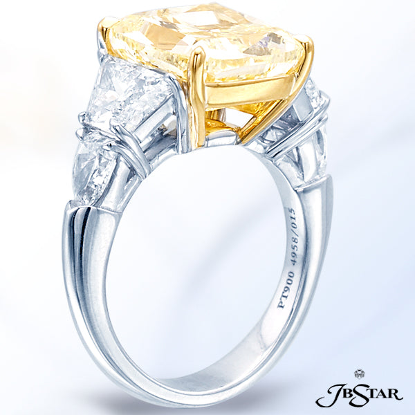 JB STAR NATURAL FANCY YELLOW DIAMOND RING FEATURING AN EXCEPTIONAL 7.04 CT FANCY YELLOW CUSHION DIAMOND, EMBRACED BY TRAPEZOID AND SHIELD DIAMONDS. PLATINUM/18KY
