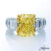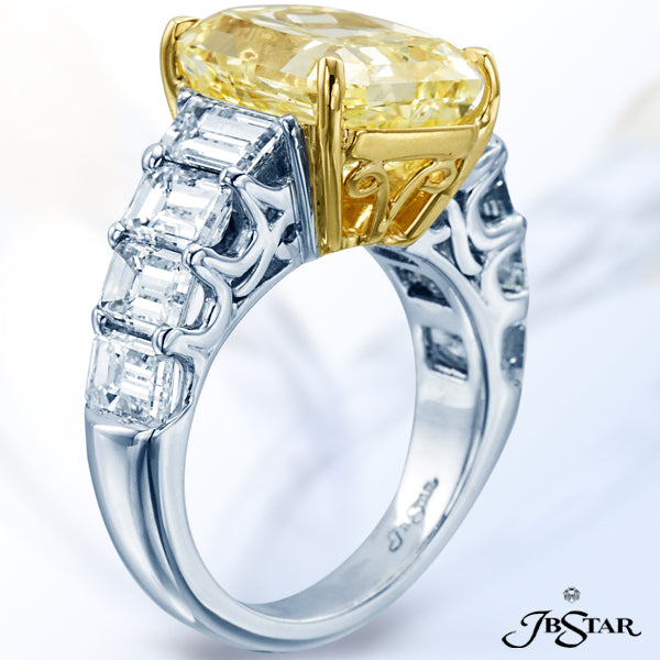 JB STAR THIS EXQUISITE PLATINUM ENGAGEMENT RING FEATURES A 9.01CT RADIANT FANCY YELLOW DIAMOND CENTER WITH PERFECTLY MATCHED TRAPEZOID AND EMERALD-CUT DIAMOND SIDES.