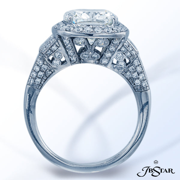 JB STAR PLATINUM DIAMOND RING FEATURING A STUNNING 4.07 CT CUSHION DIAMOND IN A MICRO PAVE SETTING A