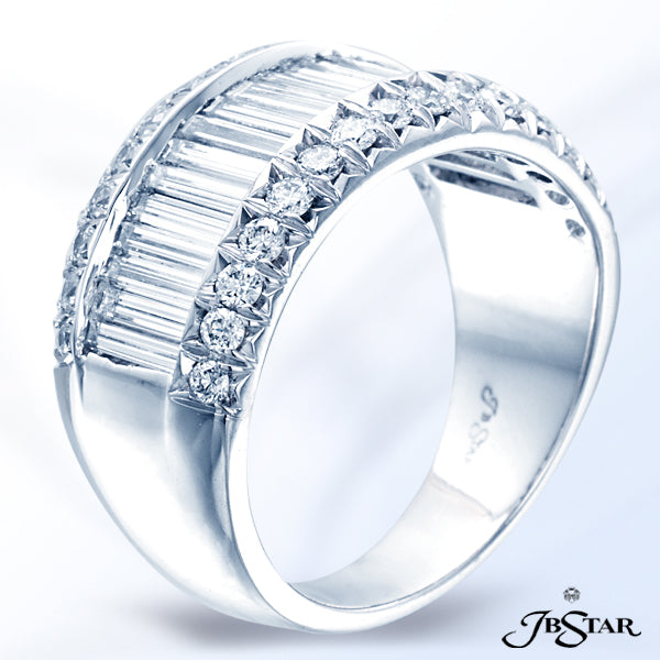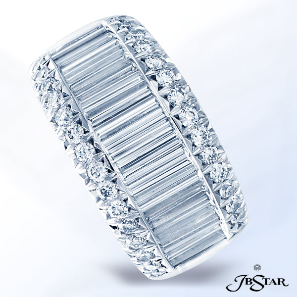 JB STAR PLATINUM DIAMOND BAND HANDCRAFTED WITH STRAIGHT BAGUETTES SET IN A CHANNEL WITH MILLEGRAIN-EDGE PAVE.