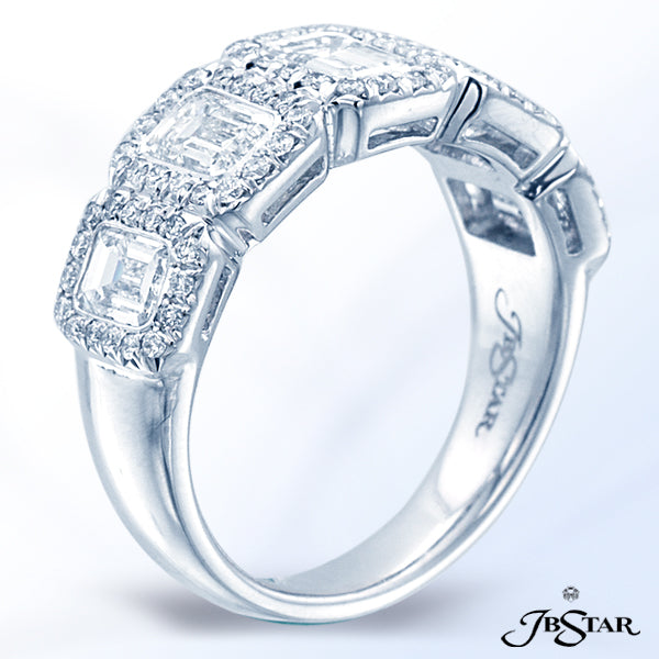 JB STAR PLATINUM DIAMOND BAND HANDCRAFTED WITH 5 EXPERTLY MATCHED EMERALD-CUT DIAMONDS IN BEZEL SETTING, EACH ENCIRCLED WITH MICRO PAVE.