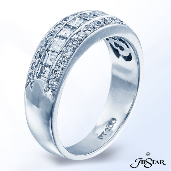 JB STAR PLATINUM DIAMOND BAND HANDCRAFTED WITH PERFECTLY MATCHED SQUARE EMERALD DIAMONDS SET IN A CENTER CHANNEL EDGED WITH MICRO PAVE.