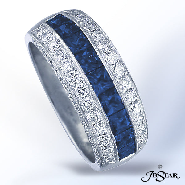 JB STAR THESE DEEP 1.31 CT. TW. PRINCESS CUT SAPPHIRES ARE BEAUTIFULLY ACCOMPANIED BY .70 CT. TW. ROUND DIAMONDS IN THIS SAPPHIRE DIAMOND WEDDING BAND.