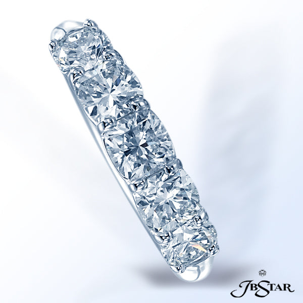 JB STAR PLATINUM DIAMOND BAND HANDCRAFTED WITH 5 PERFECTLY MATCHED CUSHION DIAMONDS IN SHARED-PRONG SETTING.