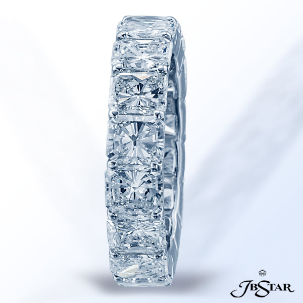 JB STAR DIAMOND ETERNITY BAND HANDCRAFTED WITH 17 PERFECTLY MATCHED RADIANT DIAMONDS IN PLATINUM SHARED-PRONG SETTING.