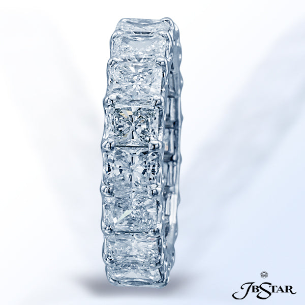 JB STAR DIAMOND ETERNITY BAND HANDCRAFTED WITH 18 PERFECTLY MATCHED RADIANT DIAMONDS IN PLATINUM SHARED-PRONG TRESTLE SETTING.