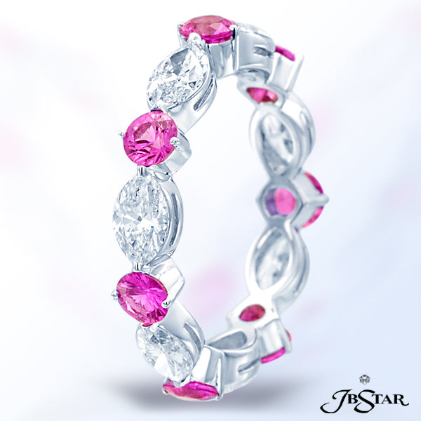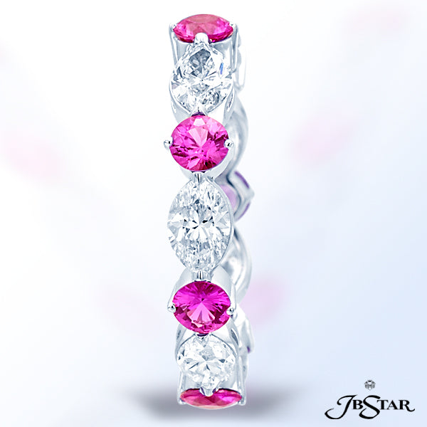 JB STAR STUNNING PLATINUM ETERNITY BAND, HANDCRAFTED USING 7 PERFECTLY MATCHED ROUND PINK SAPPHIRES AND 7 MARQUISE DIAMONDS.
