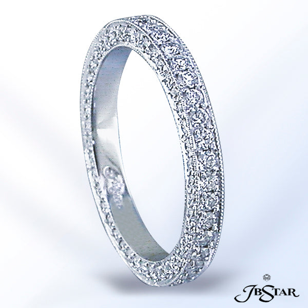 JB STAR PLATINUM DIAMOND ETERNITY BAND HANDCRAFTED OF 3-SIDED PAVE WITH MILLEGRAIN EDGE.