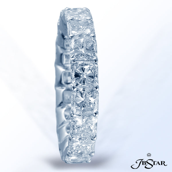 JB STAR PLATINUM DIAMOND ETERNITY BAND HANDCRAFTED WITH 18 RADIANT DIAMONDS IN SHARED PRONG SETTING.