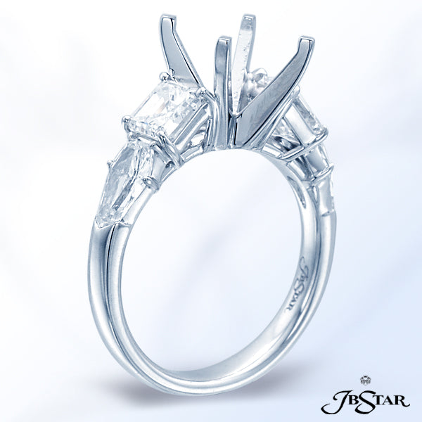 JB STAR ELEGANTLY STYLED THIS PLATINUM SEMI-MOUNT FEATURES PERFECTLY MATCHED SQUARE-EMERALD-CUT AND KITE DIAMONDS FOR A SETTING THAT STANDS OUT IN A CROWD.