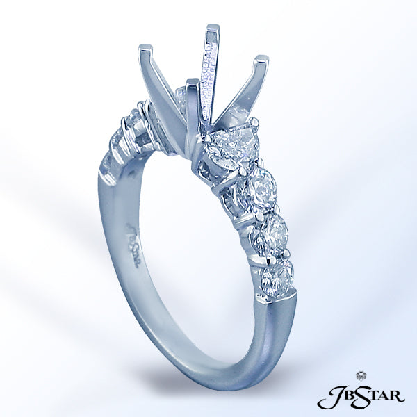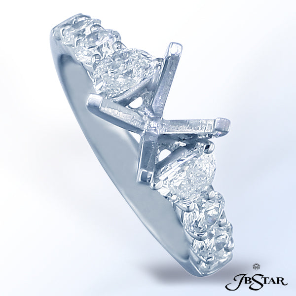 JB STAR PLATINUM SEMI-MOUNT HANDCRAFTED WITH CAREFULLY MATCHED HALF-MOON DIAMONDS EMBRACING THE CENTER FOLLOWED BY ROUND DIAMONDS DOWN THE SHANK.