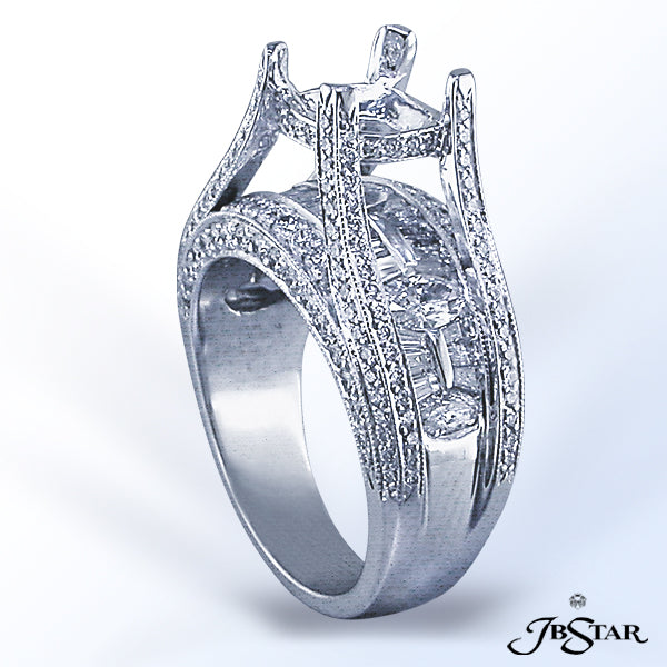 JB STAR PLATINUM DIAMOND SEMI-MOUNT HANDCRAFTED WITH A CENTER ROW OF MARQUISES AND BAGUETTES EDGED IN PAVE WITH A BRIDGE SETTING.