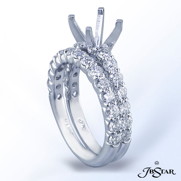 JB STAR PLATINUM DIAMOND SEMI-MOUNT HANDCRAFTED WITH 14 BRILLIANT ROUND DIAMONDS IN SHARED-PRONG SETTING. FEATURED WITH MATCHING WEDDING BAND