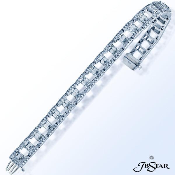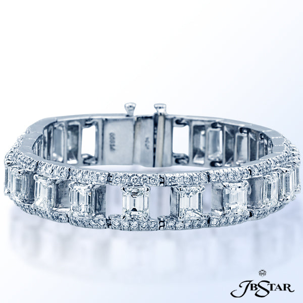 JB STAR DIAMOND AND PLATINUM BRACELET UNIQUELY DESIGNED WITH 22 PERFECTLY MATCHED EMERALD-CUT DIAMONDS SET IN A TRACK OF ROUND DIAMONDS TO CREATE AN AIRY EFFECT OF DIAMONDS ENCIRCLING THE WRIST.