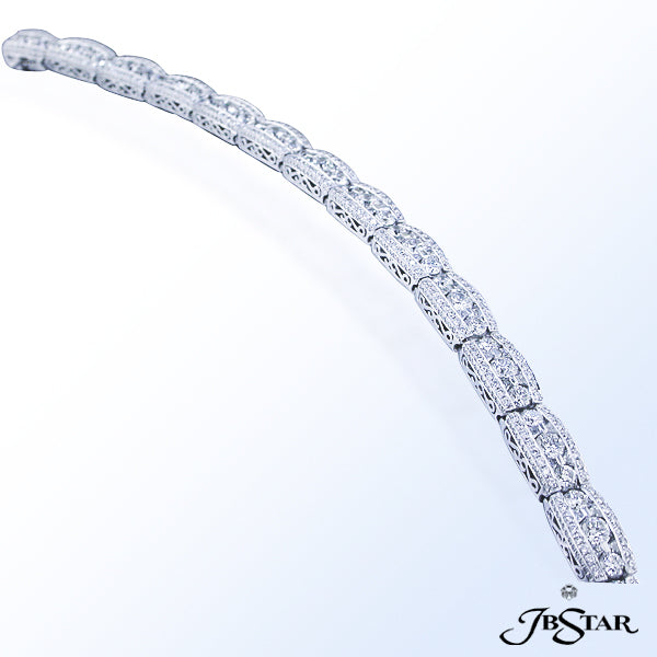 JB STAR PLATINUM DIAMOND BRACELET HANDCRAFTED WITH A CENTER CHANNEL OF BRILLIANT ROUND AND TRAPEZOID DIAMONDS, EDGED WITH ROUND DIAMONDS.