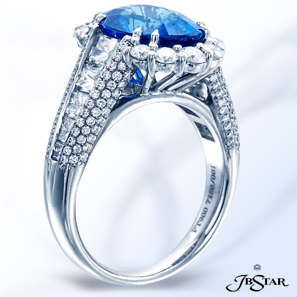 JB STAR BEAUTIFUL 4.98CT SRI LANKAN OVAL SAPPHIRE RING ENCIRCLED WITH ROUND DIAMONDS COMPLETED WITH TRAPEZOID DIAMONDS. PLATINUM