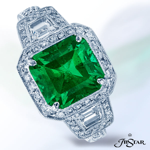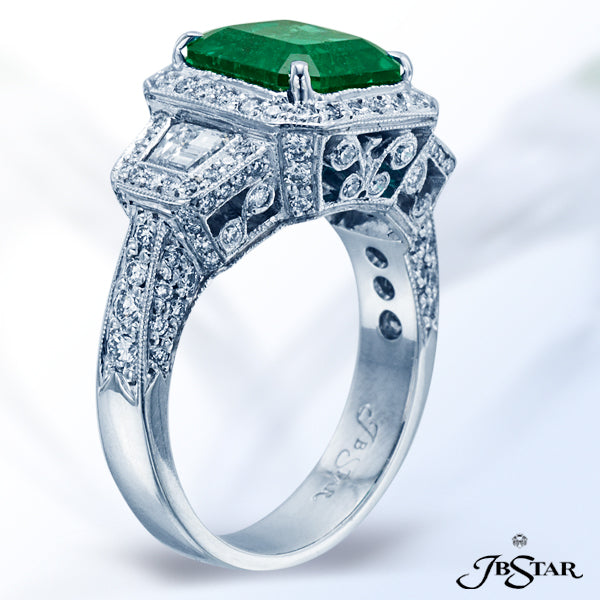 JB STAR A GLOWING 3.45 CT. EMERALD CUT EMERALD IS FRAMED BY SPARKLING .67 CT. TW. TRAPEZOID CUT AND