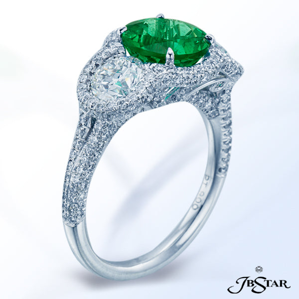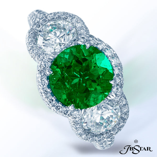 JB STAR EMERALD AND DIAMOND RING FEATURING A STUNNING 2.16 CT ROUND EMERALD EMBRACED BY TWO ROUND DIAMONDS AND HAND SET IN MICRO PAVE. PLATINUM