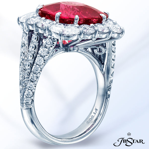 JB STAR STUNNING RED SPINEL AND DIAMOND RING FEATURING A 8.45 CT CUSHION-CUT RED SPINEL ENCIRCLED WITH OVAL AND ROUND DIAMONDS, ACCENTED BY A PAVE SHANK. PLATINUM