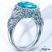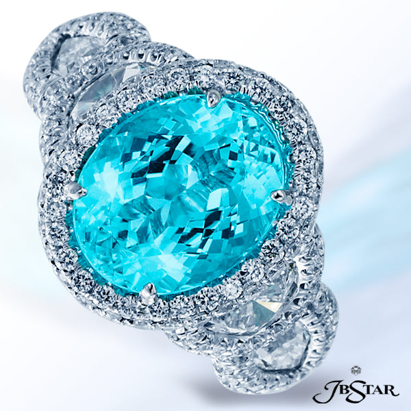 JB STAR PARAIBA AND DIAMOND RING FEATURING A BEAUTIFUL CERTIFIED 4.43 CT OVAL PARAIBA CENTER EMBRACED BY 4 HALF MOON DIAMONDS, ALL EXQUISITELY OUTLINED IN PAVE AND SET IN PLATINUM.