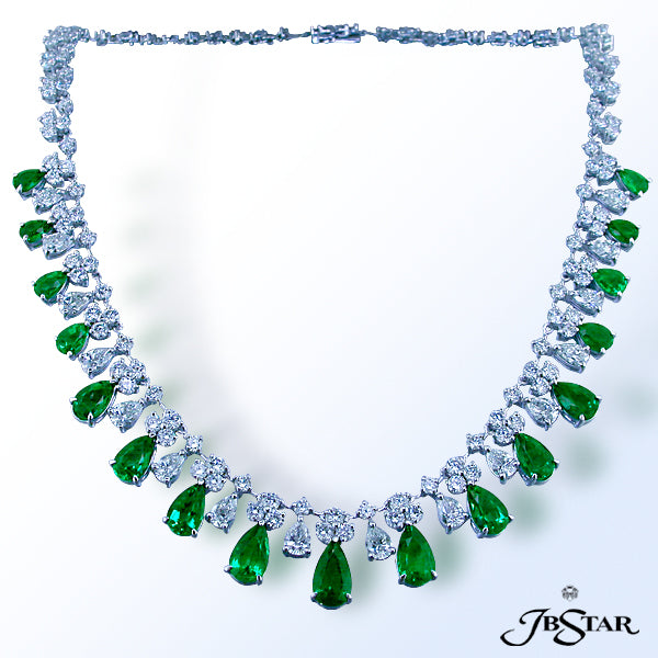 JB STAR EXQUISITE 16.57 CT. TW. PEAR SHAPE EMERALDS ELEGANTLY DANGLE FROM A SPARKLING STRAND OF 6.12 CT. TW. PEAR SHAPE DIAMONDS AND 16.12 CT. TW. ROUND DIAMONDS IN THIS ENCHANTING EMERALD AND DIAMOND