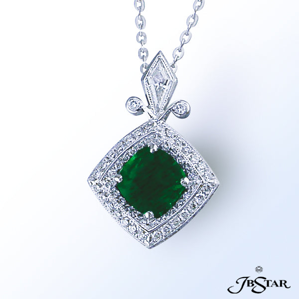 JB STAR EMERALD, & DIAMOND PLATINUM PENDANTCENTER: ROUND EMERALD 1.28 CT.DIAMONDS: 0.65 CT. TW.
