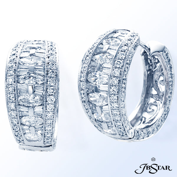 JB STAR PLATINUM DIAMOND HOOP EARRINGS FEATURING MARQUISE, BAGUETTE AND ROUND DIAMONDS.