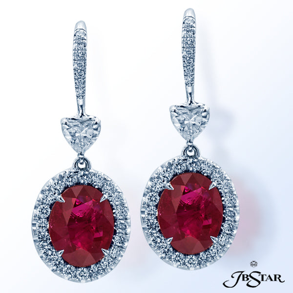 JB STAR GORGEOUS OVAL BURMA RUBY EARRINGS EDGED IN MICRO PAVE AND SUSPENDED FROM BRILLIANT DIAMONDS. PLATINUM
