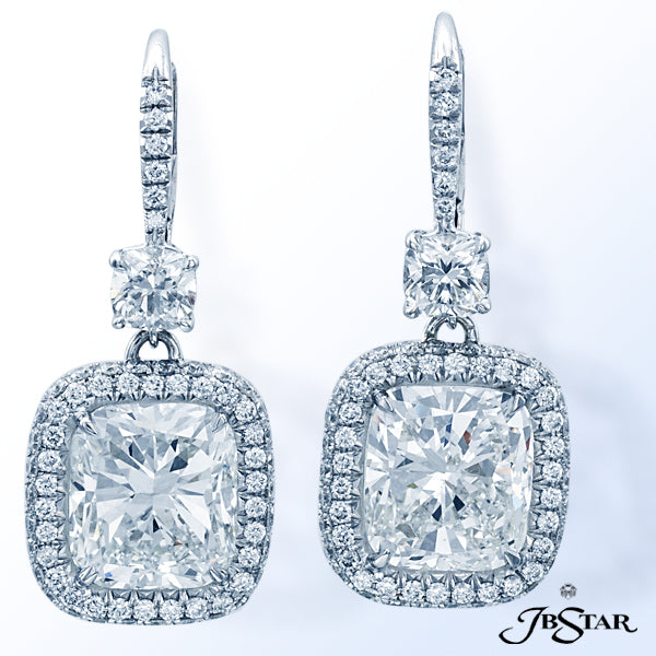 JB STAR STUNNING CUSHION-CUT DIAMOND DROP EARRINGS EDGED IN MICRO PAVE AND SET IN PLATINUM.CENTER: