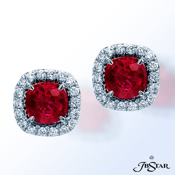JB STAR BEAUTIFULLY HANDCRAFTED EARRINGS FEATURE CUSHION-CUT RUBIES IN A MICRO PAVE SETTING. PLATINU