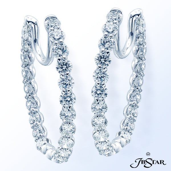 JB STAR STUNNING DIAMOND PLATINUM HOOP EARRINGS HANDCRAFTED WITH 42 PERFECTLY MATCHED ROUND DIAMONDS IN SHARED-PRONG SETTING.