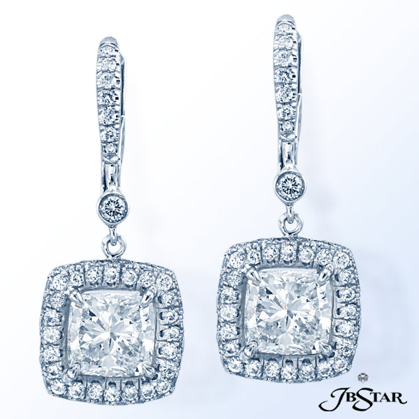 JB STAR PLATINUM DIAMOND EARRINGSCENTER: CUSHION DIAMOND 2.40 CT. TW. H VS1 GIADIAMONDS: 0.77 CT